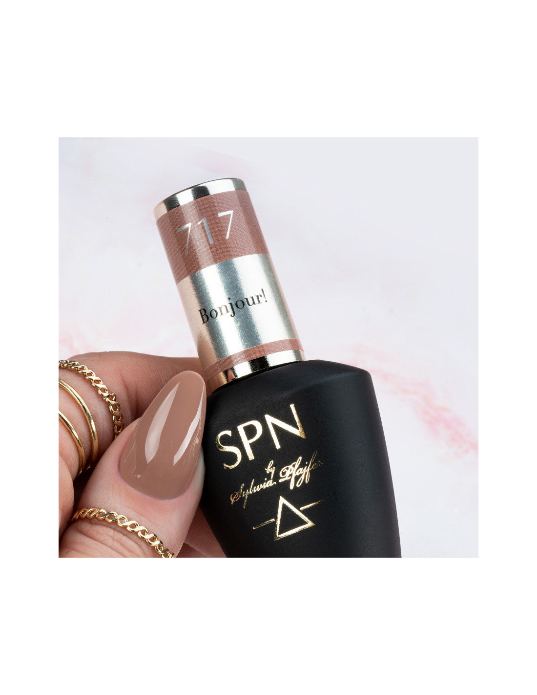 717 Bonjour! é um castanho leitoso doce. Cor original que atrai a atenção e encanta com o brilho intenso. UV LaQ é um verniz híbrido que não tem comparação. Criado apenas com resina de silicone, harmoniza perfeitamente com a placa natural, criando uma camada elástica que se adapta bem à unha. Não racha, despedaça ou descasca da margem livre. Graças à resina única, o verniz híbrido UV LaQ pode ser aplicado mesmo em unhas naturais longas sem receio de rachar ou apresentar o efeito "teia de aranha". O verniz híbrido SPN é excepcionalmente suave para a placa natural e pode ser utilizado com sucesso por pessoas com pele sensível e até atópica. Aplicado sobre acrílico ou gel, funciona perfeitamente com o material duro, e graças à sua forte aderência, não desliza da unha e não se desgasta na margem livre. Semelhante ao verniz de unhas clássico, a textura média-espessa e o pincel plano garantem facilidade de aplicação e um acabamento excecionalmente preciso. A manicure híbrida é durável, forte, resistente a danos e mesmo após 6 semanas continua a parecer impecável.